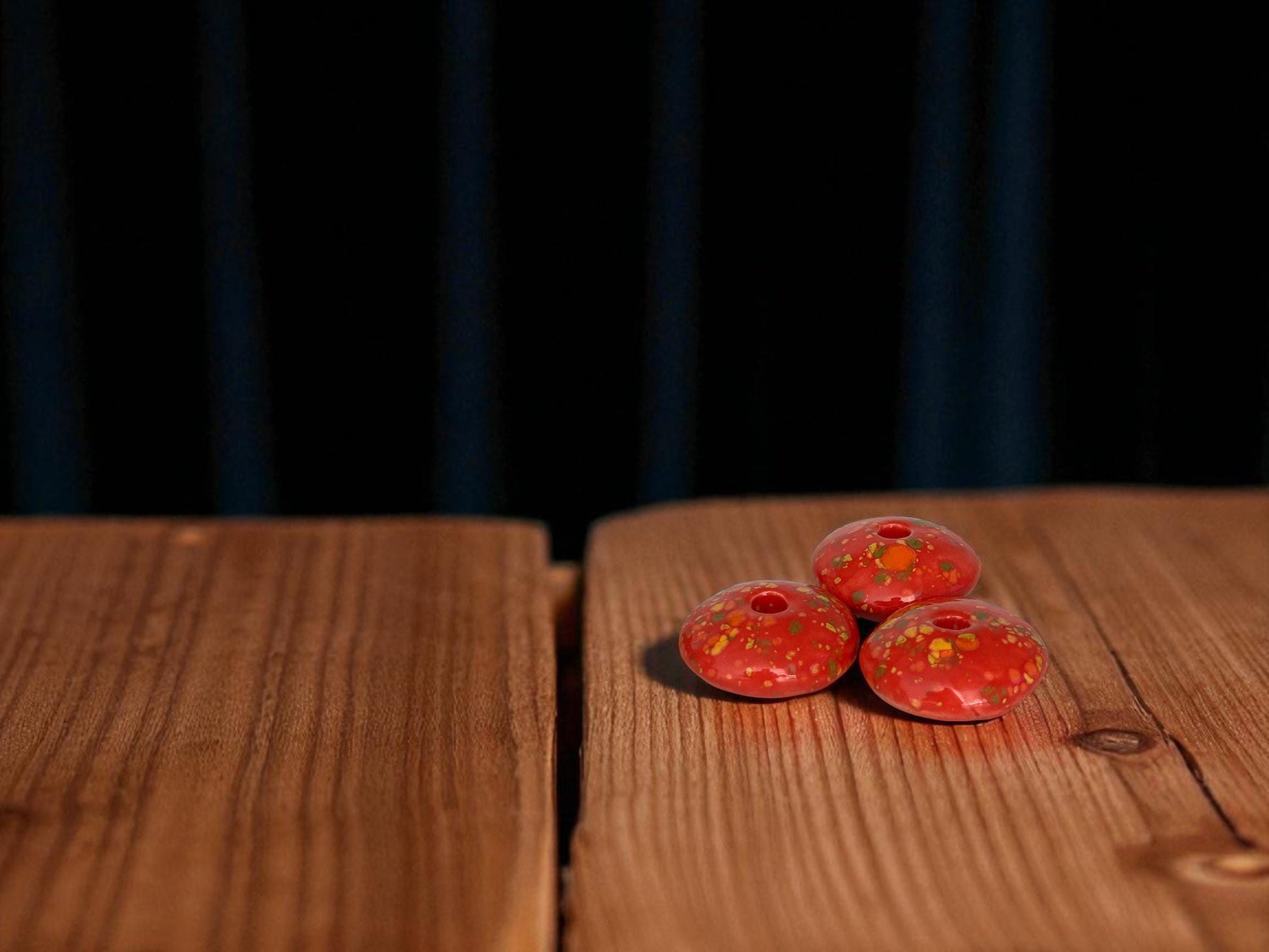This coral red ceramic candle holder is handcrafted and finished with subtle speckles of gold, orange, and mossy green glaze. Designed to complement slim 5 mm beeswax taper candles, it adds a quiet accent of color without overpowering the space.