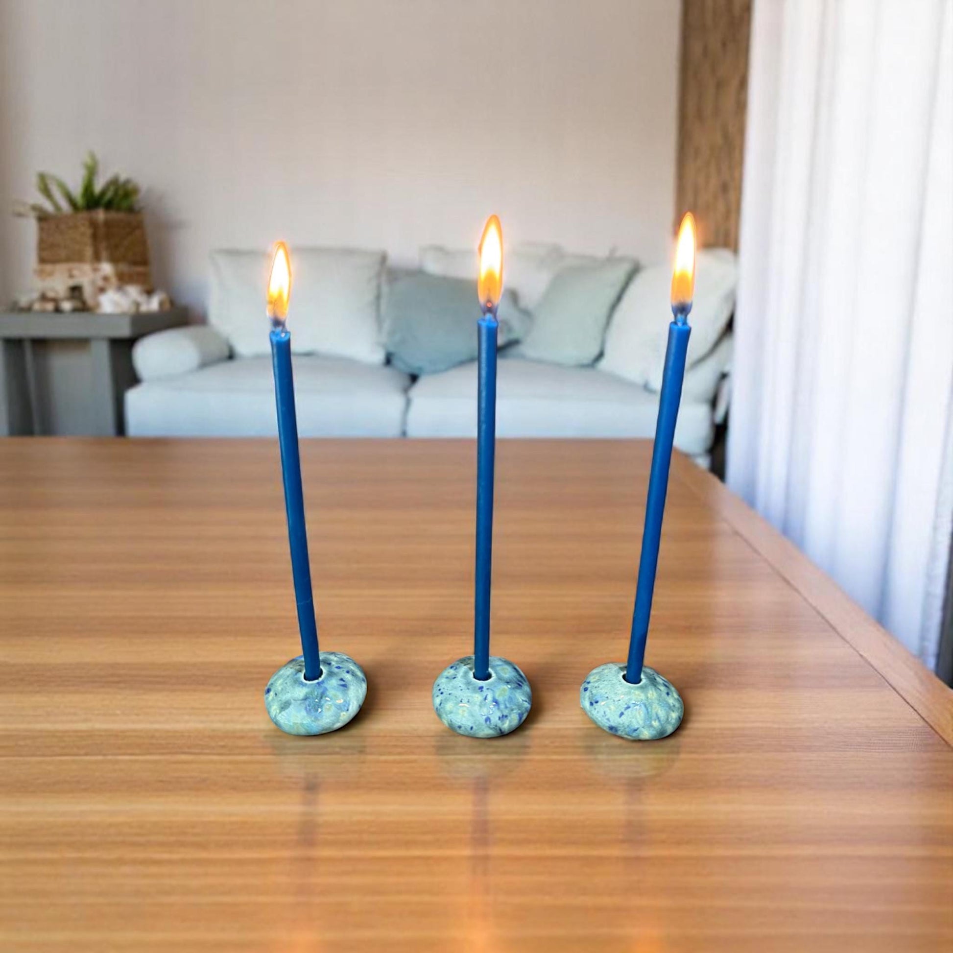 This seafoam green ceramic candle holder is handcrafted and finished with layered glazes in soft green, jade, and deep blue tones. Designed to hold slim 5 mm beeswax taper candles, it adds a subtle coastal accent without overpowering the space.