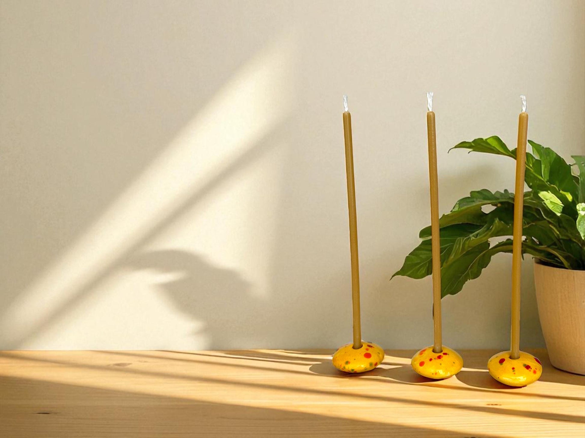 This yellow ceramic candle holder is handcrafted and finished with subtle speckles of red, orange, and mossy green glaze. Designed to complement slim 5 mm beeswax taper candles, it adds a warm accent of color without overwhelming the space.